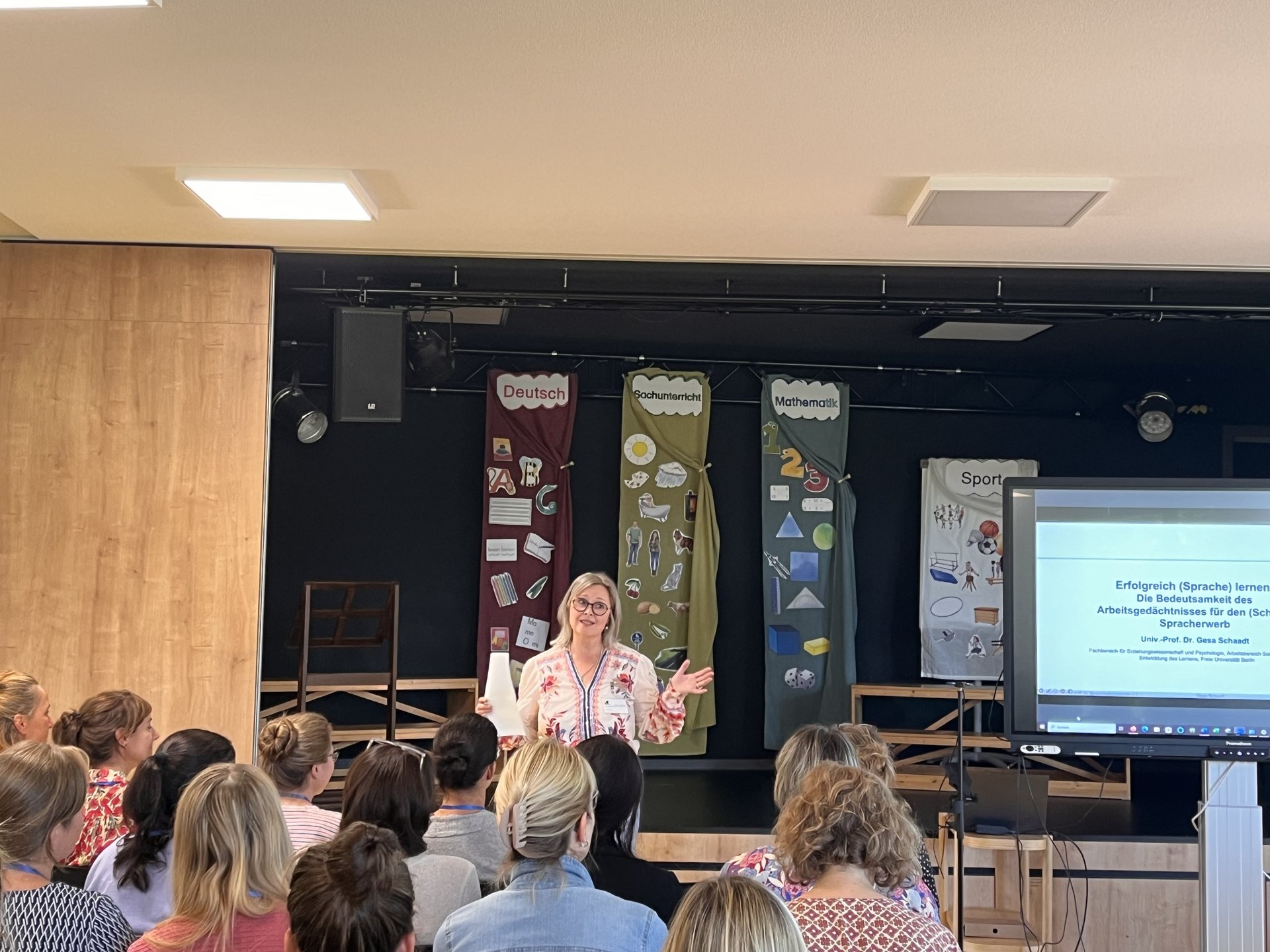 erwartete die Teilnehmenden ein vielseitiges Programm mit praxisnahen Workshops zu unterschiedlichen Themen aus dem Bereich der Sprachheilpädagogik. Nach der Eröffnung durch die dgs-Landesvorsitzende Antje Leisner und Willkommensworten der Schulleitung Iris Seitz startete der Tag mit einem Einführungsvortrag von Prof. Dr. Gesa Schaadt aus Berlin. Unter dem Titel „Die Bedeutsamkeit des Arbeitsgedächtnisses für den (Schrift-) Spracherwerb “ erklärte uns Prof. Dr. Schaadt die Grundlagen des Arbeitsgedächtnisses und welche wichtigen Aufgaben es im Laufe des Spracherwerbs es übernimmt. Anschließend verteilten sich alle in die darauffolgenden Workshops. Die engagierten Referentinnen und Referenten sorgten mit fundierten Inhalten und interaktiven Methoden für einen lebendigen und erkenntnisreichen Austausch.